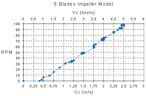 O modelo turbina, representado ao lado, foi testado na prática. O sistema rotativo total era definido por um momento de inércia de 0.15 kg.m2. Os testes consistiram na medição da frequência angular de rotação do sistema em RPM em função da velocidade do escoamento Vt. De acordo com os resultados obtidos, o sistema começava a rodar a uma velocidade de escoamento de aprox. 0.5 m/s (1 knot), atingindo uma frequência angular de rotação 100 RPM para uma velocidade de escoamento de 2.5 m/s (5 knots). |