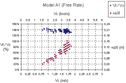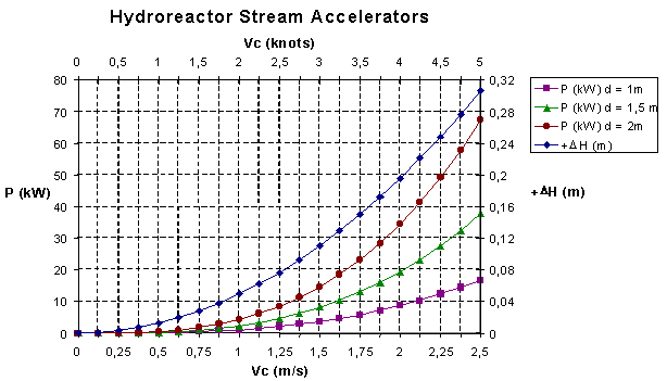 Power Generation From the efficiency studies performed in practice with the sensing and acquisition of real measurements, it was proved that for the more efficient stream accelerator model (model A1) named as hydroreactor stream accelerator, the flow velocity Vt through the channel narrower zone, is in absence of any flow constraints about 40% higher than velocity Vc of outside free stream. It was also verified that, in the absence of any flow constraints there is a certain constancy on the ratio Vt/Vc between the flow velocity Vt and the stream velocity Vc, for typical stream velocity values, meaning that hydroreactor stream accelerators present almost steady efficiency values in the range of typical stream velocities. This means that the loading (energy per liquid mass) of the flow in the channel narrower zone is about 2 times higher than the outside free stream loading and the power density in the channel narrower zone about 2,75 times higher than the outside free stream power density. It means also that the hydroreactor stream accelerator introduces a significant net head +DH of about 200 mm for a stream of 2 m/s (4 knots), 300 mm for a stream of 2,5 m/s (5 knots) and 400 mm for a stream of 3 m/s (6 knots). The following graphic shows